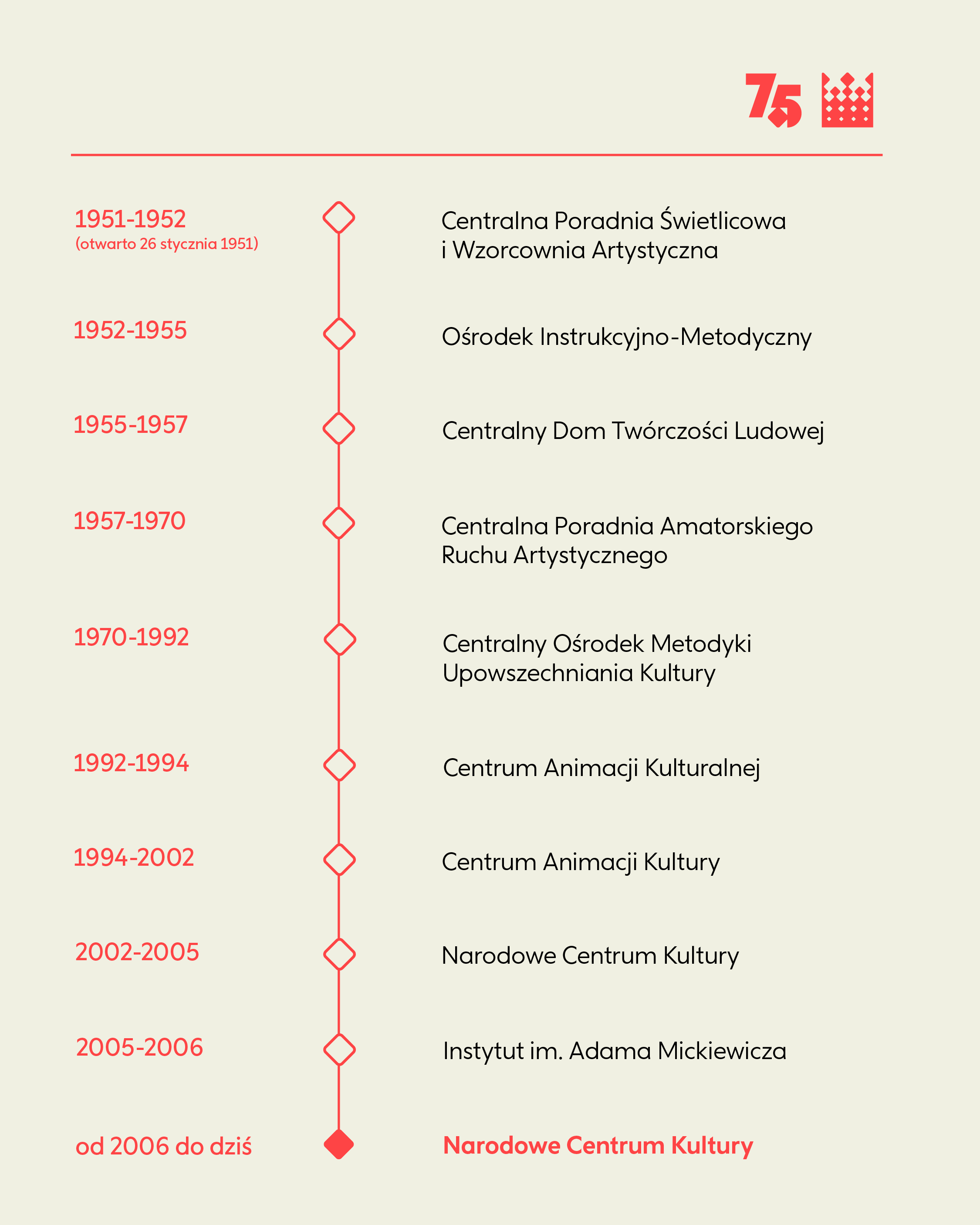 Siedemdziesiąt pięć lat to piękny wiek dla instytucji kultury. Wystarczająco długi, by mieć tradycję i doświadczenie. Wystarczająco młody, by eksperymentować i szukać nowych dróg. W gąszczu nazw i skrótowców – CPŚiWA, CDTL, CPARA, COMUK, CAK, NCK, widać nieustanną próbę stworzenia odpowiedzi na potrzeby chwili. Nieustanne staranie, by najsensowniej dopasować pomysły do rzeczywistości. To, co było potrzebne w 1951 roku, nie było potrzebne w 1970. To, co działało w 1992, nie zadziała w 2026. Ale idea pozostaje ta sama: wspierać tych, którzy tworzą kulturę u podstaw. Tych, którzy w małych miasteczkach prowadzą zespoły teatralne. Tych, którzy w wiejskich świetlicach uczą dzieci malować. Tych, którzy w bibliotekach organizują spotkania literackie. Tych, którzy w domach kultury budują wspólnoty.