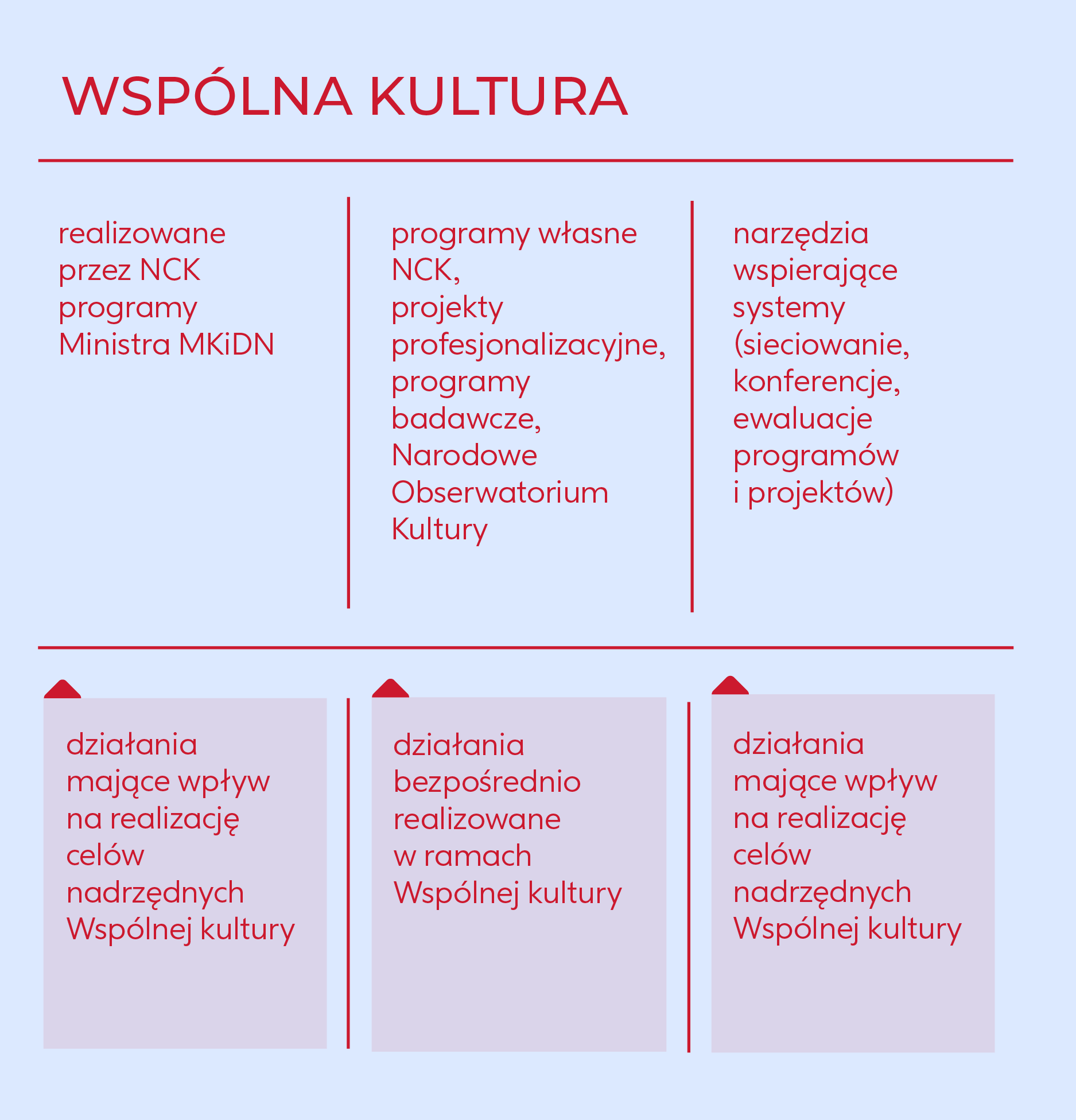 Wspólną kulturę charakteryzuje podejście strategiczne i systemowe zakładające, że działania Narodowego Centrum Kultury są realizowane za pomocą różnych narzędzi jako elementy większego, holistycznego systemu wsparcia. Kluczowymi sposobami działania są: