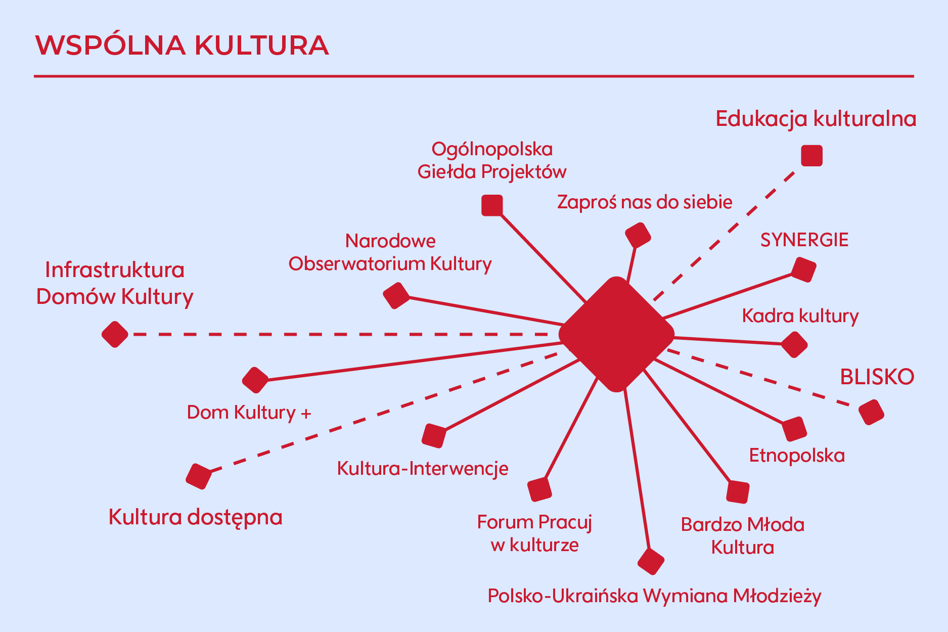 Wspólna kultura realizowana jest poprzez konkretne programy dotacyjne NCK: Bardzo Młoda Kultura, Dom Kultury+, EtnoPolska, Kultura-Interwencje, Polsko-Ukraińska Wymiana Młodzieży i SYNERGIE oraz wspierana przez programy MKiDN: Edukacja kulturalna, Infrastruktura domów kultury i Kultura dostępna. Elementami Wspólnej kultury są również projekty profesjonalizacyjne: Zaproś nas do siebie, Ogólnopolska Giełda Projektów, Forum Pracuj w kulturze, Kadra kultury oraz działania badawcze, w tym przede wszystkim Narodowe Obserwatorium Kultury. Każde z tych działań odnosi się do wartości celów nadrzędnych oraz wykorzystuje opisane wyżej metody pracy.