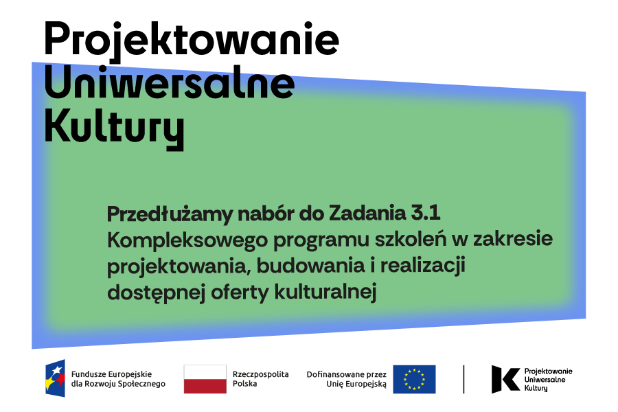 Projekt “Projektowanie Uniwersalne Kultury – Dostępność w Instytucjach Kultury” jest finansowany ze środków Unii Europejskiej w ramach działania 3.3 “Systemowa Poprawa Dostępności” Priorytetu III “Dostępność i Usługi dla Osób z Niepełnosprawnościami” Programu Fundusze Europejskie dla Rozwoju Społecznego 2021-2027.