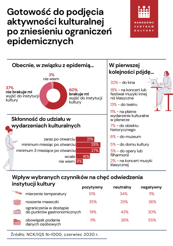 Zachęcamy do zapoznania się z pełnymi wynikami w komunikacie „Gotowość do podjęcia aktywności kulturalnej po zniesieniu ograniczeń epidemicznych” oraz infografiką, która prezentuje wybrane wyniki.