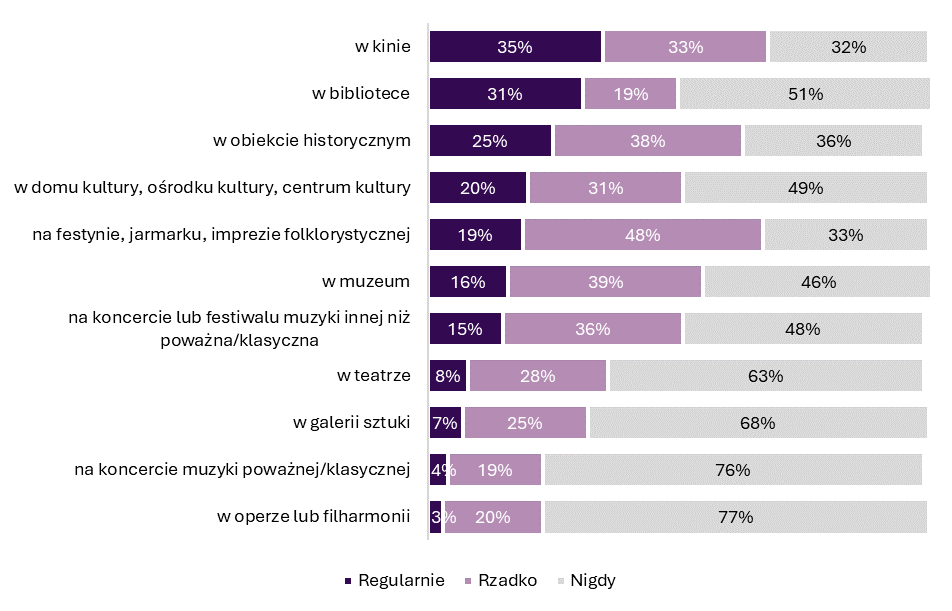 Spośród rodzajów aktywności kulturalnej, o które pytaliśmy, największą popularnością cieszy się kino: ponad jedna trzecia badanych (35%) deklaruje, że bywa w nim często. Na dalszych miejscach znalazły się biblioteki, obiekty historyczne, domy kultury. Najrzadziej bywamy w operze lub filharmonii oraz na koncertach muzyki poważnej.