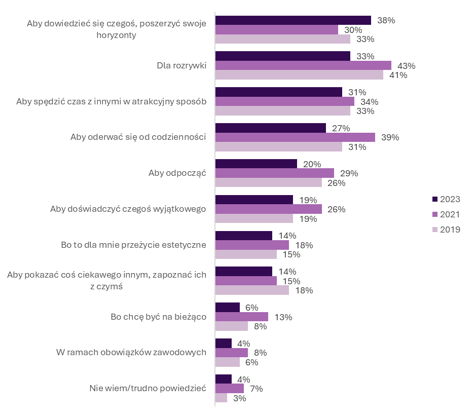 Badani najczęściej deklarują, że podejmują aktywności kulturalne, by dowiedzieć się czegoś, poszerzyć swoje horyzonty. To zmiana: we wcześniejszych sondażach najczęściej wskazywali motywację rozrywkową, która w tegorocznym badaniu znalazła się na drugim miejscu. Znacząca grupa respondentów wskazywała także na chęć spędzenia czasu z innymi w atrakcyjny sposób. Z kolei w badaniu z 2021 – z czasu pandemii – bardzo wielu respondentów wskazywało także chęć oderwania się od codzienności.