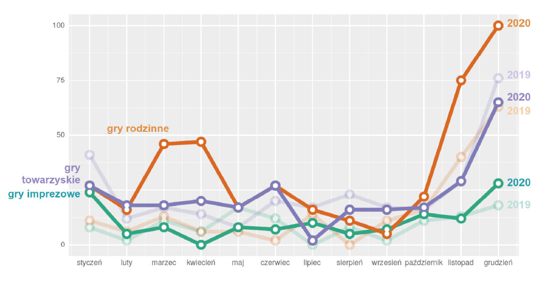 Podobnie jak w wielu innych krajach, zainteresowanie grami planszowymi w Polsce ma charakter sezonowy – znacząco rośnie w okresie przed świętami Bożego Narodzenia. W 2020 r. zainteresowanie planszówkami było w internecie zauważalnie wyższe niż w roku poprzednim, dodatkowo obserwowaliśmy wzrost zainteresowania wiosną, w związku z pandemią.