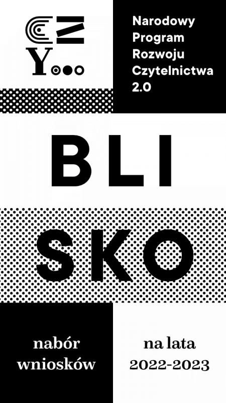 Zapraszamy biblioteki publiczne zainteresowane złożeniem wniosku do konkursu dotacyjnego BLISKO – Biblioteka | Lokalność | Inicjatywy | Społeczność | Kooperacja | Oddolność, realizowanego w ramach Narodowego Programu Rozwoju Czytelnictwa 2.0, Kierunek interwencji 4.1, na spotkanie informacyjne on-line.