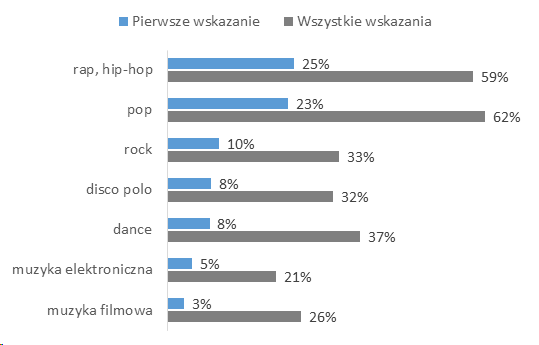 Ranking popularności gatunków oparty na wszystkich wskazaniach nastolatków jest zbliżony do rankingu gatunków muzycznych słuchanych najczęściej. Największa grupa osób deklaruje słuchanie popu (62%) oraz rapu/hip-hopu (59%). Często wskazywane są również dance (37%), rock (33%), disco polo (32%), muzyka filmowa (26%) oraz muzyka elektroniczna (21%).