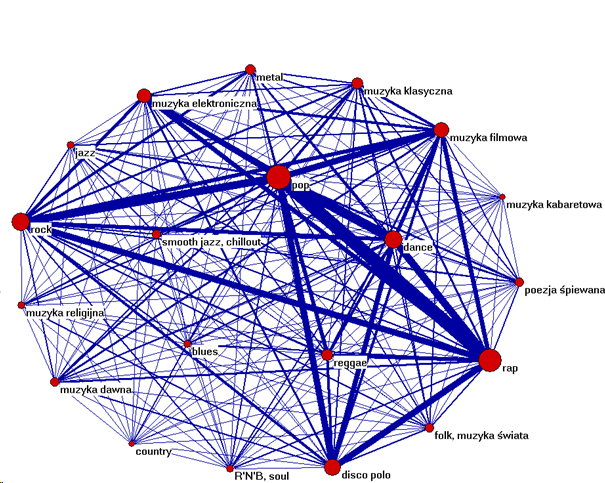 W oparciu o wszystkie zebrane odpowiedzi utworzyłem sieć powiązań pomiędzy gatunkami muzycznymi (gdzie pojedynczą relacją jest słuchanie dwóch gatunków przez tę samą osobę). Wielkość czerwonych kół oznaczających gatunki muzyczne jest proporcjonalna do liczby osób słuchających danego gatunku. Im grubsza linia łączy dwa gatunki, tym silniejsza relacja je łączy. Przykładowo: 800 osób zadeklarowało równocześnie słuchanie popu i rapu. Oznacza to, że pop i rap łączy 800 pojedynczych relacji, co można przedstawić jako jedną relację o wartości 800. Słuchanie popu i muzyki klasycznej zadeklarowało 185 osób, więc gatunki te łączy relacja o sile 185. Sieć powiązań pomiędzy gatunkami prezentuje poniższe ilustracja (rozkład oparty na algorytmie Kamada-Kawai, uwzględnia siłę powiązań pomiędzy gatunkami).