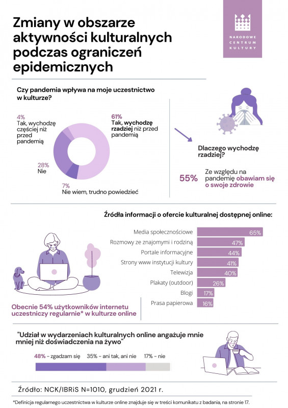 Pandemia zmienia zwyczaje i przekierowuje uwagę Polaków na wydarzenia kulturalne dostępne online. Liczba osób deklarujących uczestnictwo online wyraźnie wzrosła względem poprzedniego pomiaru. Obecnie 56% użytkowników internetu uczestniczy w kulturze online regularnie. Najbardziej popularne wśród publiczności formy oferty kultury online (spośród form udostępnianych przez instytucje kultury), to występy nagrane przez artystów i transmitowane „na żywo” wydarzenia kulturalne, a także spotkania i dyskusje społeczności online. Z każdej z tych form uczestnictwa korzysta ok. 30% badanych. O ofercie kultury online respondenci czerpią wiedzę głównie z portali społecznościowych (65% badanych) oraz od znajomych i rodziny (47% osób).