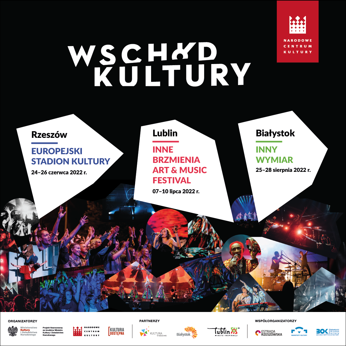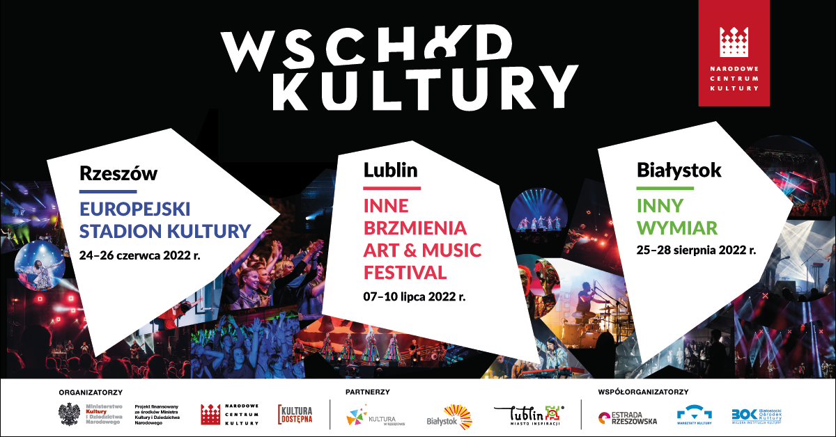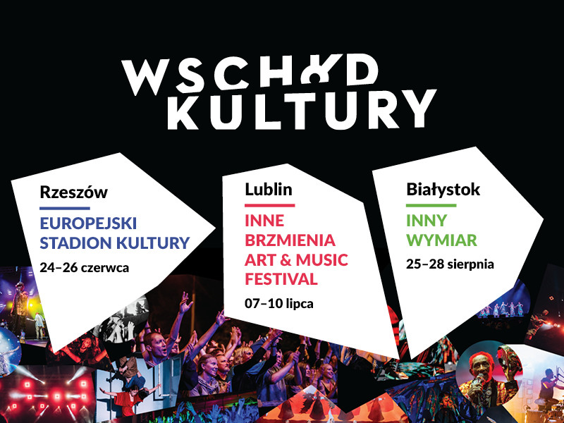 Festiwal Wschód Kultury – unikalne w skali kraju cykliczne przedsięwzięcie, będące efektem partnerskiej współpracy Narodowego Centrum Kultury (NCK) i największych ośrodków kulturalnych Polski Wschodniej - po raz kolejny w czerwcu, lipcu i sierpniu zaprasza na kilkadziesiąt bezpłatnych wydarzeń w Białymstoku, Lublinie i Rzeszowie. Koncerty, wystawy, spektakle, seanse filmowe, projekcje, warsztaty, spotkania teatralne i literackie, a wśród nich polskie premiery to efekt artystycznej współpracy polskich i zagranicznych artystów, przede wszystkim zza naszej wschodniej granicy i z terenów objętych Partnerstwem Wschodnim, ale nie tylko.