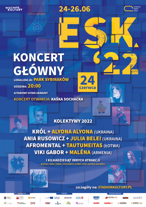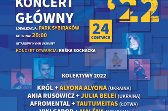 Festiwal to nie tylko twórcze spotkania i artystyczny dialog z kulturą krajów naszego regionu, ale również kolejna demonstracja solidarności z naszymi sąsiadami z Ukrainy i uchodźcami, którzy w Polsce znaleźli bezpieczne schronienie przed wojną. Rzeszowski Koncert Główny, który odbędzie się 24 czerwca w godzinach 20.00 – 23.30, transmitowany na żywo w TVP2 i TVP Kultura od 21.00, rozpocznie się wyjątkowym gitarowym wykonaniem hymnu Ukrainy oraz nagraniem prezydenta Wołodymyra Zełenskiego, a w kolektywach, które są znakiem rozpoznawczym rzeszowskiej odsłony festiwalu, wystąpią m. in. dwie ukraińskie artystki: Alyona Alyona (sensacja i nowa gwiazda ukraińskiego rapu, którą dostrzegł już New York Times) oraz Julia Belei w duecie odpowiednio z Królem i Anią Rusowicz.