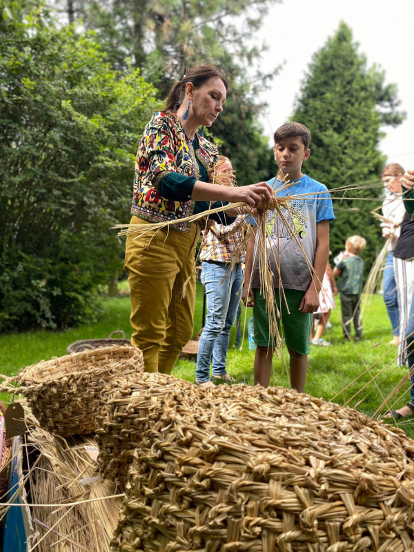 makramy, plecionkarstwa i pająków ludowych. Warsztatom towarzyszyły śpiewaczki z zespołów ludowych, które uczyły uczestniczki