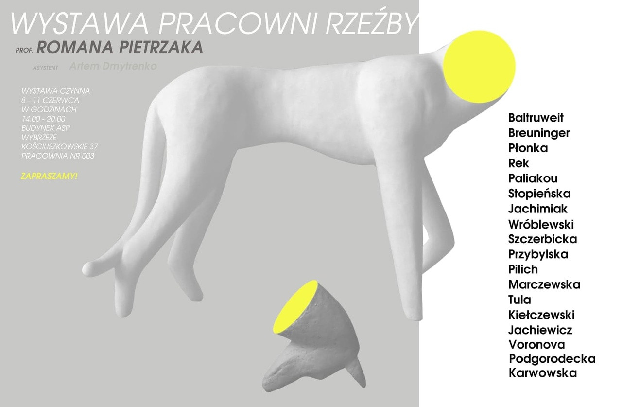 W dniach 8-11 czerwca 2023 r., w godz. 14.00-20.00 w budynku Akademii Sztuk Pięknych w Warszawie (ul. Wybrzeże kościuszkowskie 37, pracownia nr 003) odbędzie się wystawa Pracowni Rzeźby prof. Romana Pietrzaka, na której będzie można zobaczyć prace białoruskiego artysty Aleksieja Wróblewskiego - obecnego stypendysty programu Gaude Polonia.