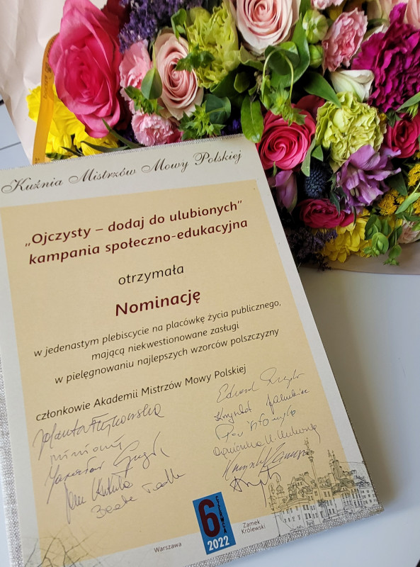 Kampania społeczno-edukacyjna Ojczysty – dodaj do ulubionych, prowadzona przez Narodowe Centrum Kultury ze środków Ministra Kultury i Dziedzictwa Narodowego od 2012 r., zyskała uznanie Akademii Mistrzów Mowy Polskiej i nominację do tytułu Kuźni Mistrzów Mowy Polskiej w tegorocznej XXII edycji Programu. Uroczyste wręczenie nominacji odbyło się 6 czerwca 2022 r. w Zamku Królewskim w Warszawie.