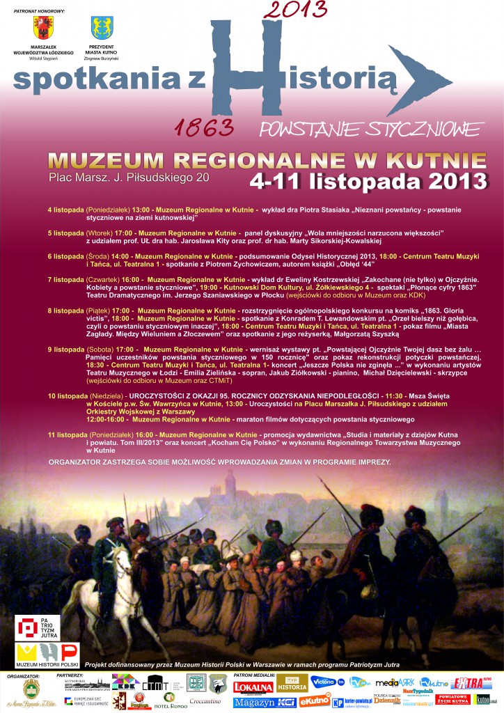 13:00 – Muzeum Regionalne w Kutnie – wykład dra Piotra Stasiaka „Nieznani powstańcy – powstanie styczniowe na ziemi kutnowskiej”