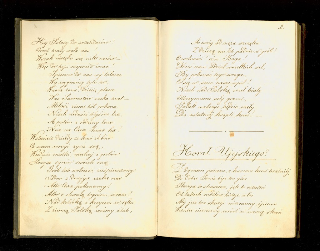 Na 173 stronach rękopisu (odręcznie paginowanych) podziwiać możemy pięknie kaligrafowane pieśni patriotyczne. W zbiorze znalazły się między innymi Hymn wolności, Horał Ujejskiego, Pożegnanie kraju, Marsz Dwernickiego, Śmierć jenerała Sowińskiego, Śpiew z Mogiły, Ułan pod Brodnicą, Podolanka, Pieśń Legionu (Jeszcze Polska nie zginęła…), Sarmatka, Pieśń patryoty, Cieniom poległych w Warszawie 27 marca 1861, Śpiew akademików lwowskich, Pieśń jeńców w niewolę pędzonych, Pieśń do cesarza Napoleona na wyspie św. Heleny.